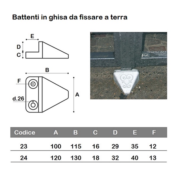 Battenti in ghisa per cancelli a doppia anta, da fissare a terra.