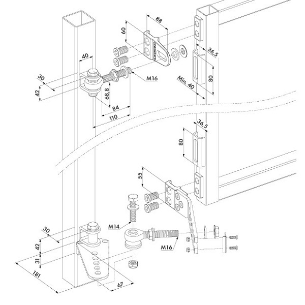 Kit di cardini inox per cancelli con aperture a 180° e terreni con pendenza da 2° a 35°.