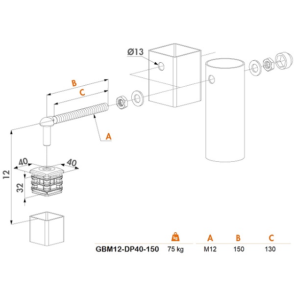 Kit cardine inox M12, con inserto in alluminio rinforzato per tubo quadro da 40 mm