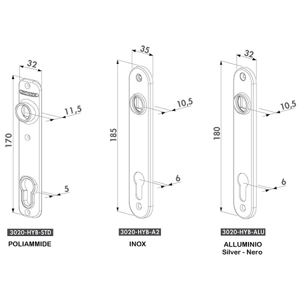 Placche di copertura fori cilindro e maniglia per serrature da incasso, in poliammide (STD), inox (A2), alluminio anodizzato (silver – nero)