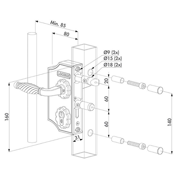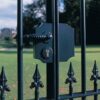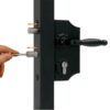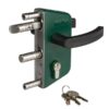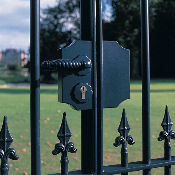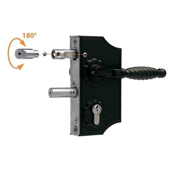 Serratura di qualità in acciaio inox con cover in alluminio, ornamentale per cancelli, con scrocco regolabile e reversibile per apertura Dx-Sx. Maniglie in alluminio anodizzato, catenaccio inferiore bloccabile con chiave.