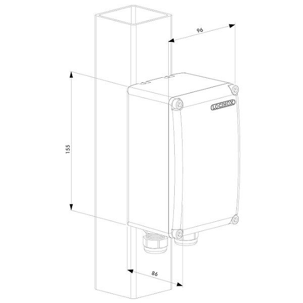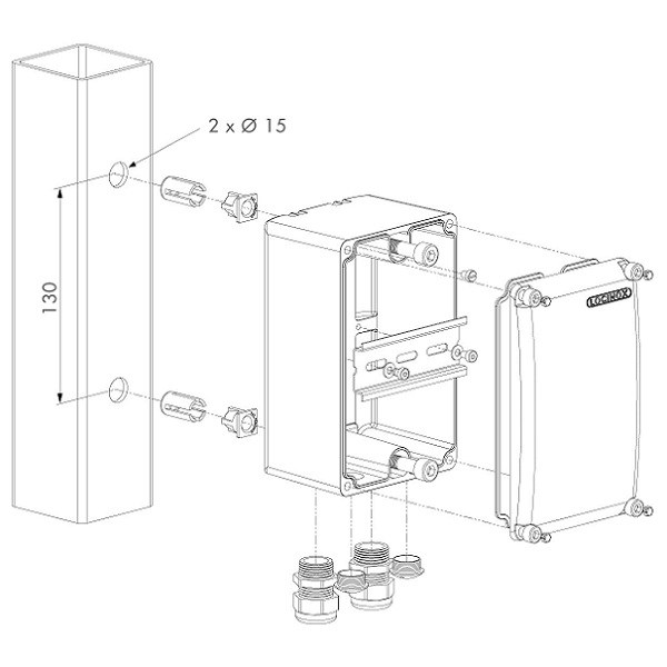 Scatola di alloggiamento per trasformatore DC-Power, in alluminio verniciato a polvere, e dotato di tasselli Quick-Fix per il fissaggio su tubolari.