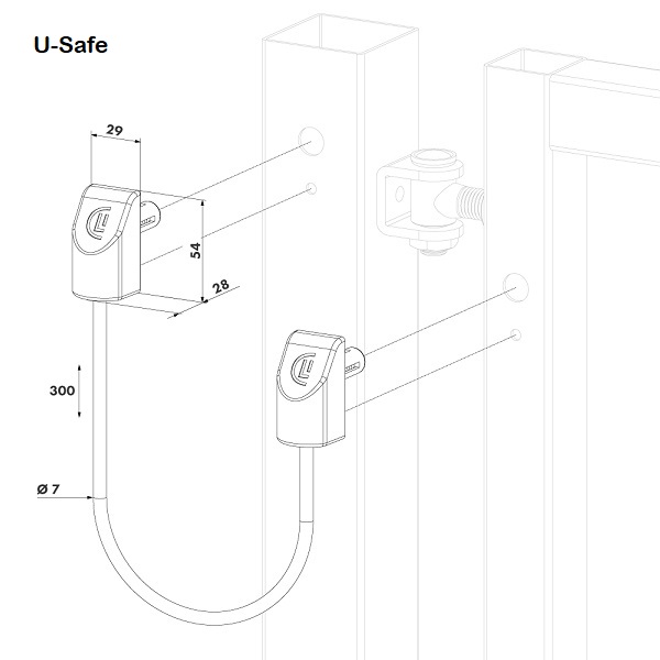 Fune di sicurezza anticaduta per cancelli, con cavo in acciaio INOX d.5 x 300 mm con guaina protettiva trasparente di 1 mm di spessore. Dotazione di 2 tasselli Quick-fix brevettati per tubolari in ferro (anta e colonna), più un tassello per colonne in muro o calcestruzzo.